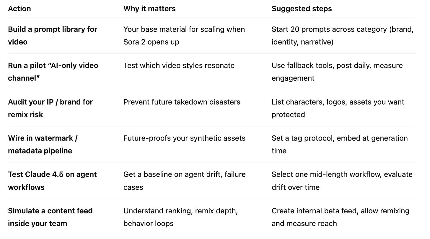 This week, something shifted. The frontier of AI is no longer just text or code — it’s motion, vision, sound, and identity. Sora 2 dropped. Claude 4.5 crept past durability thresholds. Agent orchestration is now a baseline expectation. And underneath, the battles over rights, authenticity, and platform control are heating up.